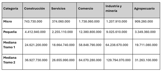 4.1 Sus ventas totales anuales en pesos no deberán superar los valores expuestos en el listado que se detalla a continuación, publicado por el Gobierno Nacional en el Boletín Oficial mediante la Resolución 1/2026,. En la misma, se actualizaron los valores oficializando los nuevos límites de los parámetros para la inscripción de las empresas que encuadran en las categorías de PYMES. Los montos máximos se dividen en cinco categorías que abarcan Comercio, Industria y Minería, Construcción, Servicios y Agro.